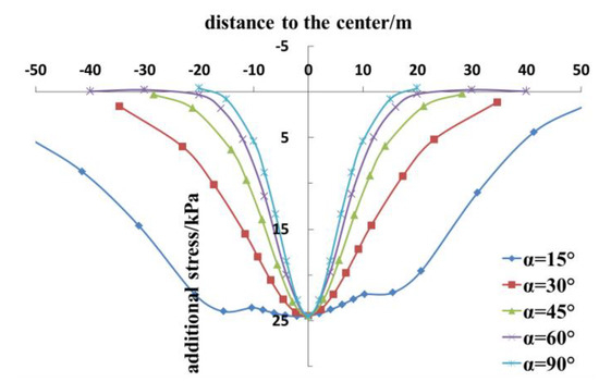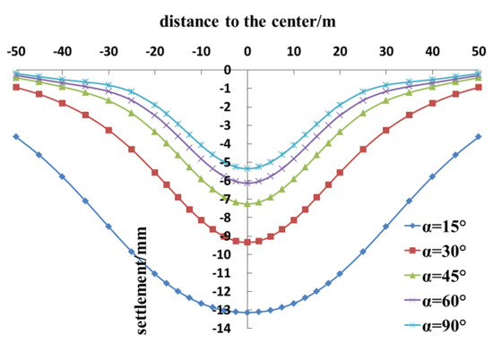 Figure 14 and Figure 15 delineate the comparison of the additional stress on and the vertical displacement of the existing tunnels at different tunnel crossing angles. According to these figures, first, as α decreases, the maximum value of the additional stress in the center of the existing tunnel remains almost unchanged at about 25 kPa, but the range of the additional stress on the existing tunnel increases. Second, when the tunnel crossing angle is greater than or equal to 30°, the additional stress follows a normal distribution. When α = 15°, due to the small crossing angle between the old and the new tunnels, the influence range of the excavation and the grouting ring on the existing tunnel increases. The additional stress curve near the crossing center becomes gentle due to the grouting ring. As the tunnel crossing angle continues to decline, the curve gradually bulges upward. Third, the additional stress curve is not symmetrically distributed along the traversing center. In fact, since the shield excavation surface is located at x0 = 40 m, the additional stress near the negative direction is slightly larger than that in the positive direction. Fourth, the settlement of the existing tunnel increases with the decrease in the tunnel crossing angle. Indeed, when α is set at 90, 60, 45, 30, and 15°, the maximum settlement of the existing tunnel across the center is 5.35, 6.13, 7.26, 9.34, and 13.14 mm respectively. Fifth, as α declines, the influence range of the settlement of the existing tunnels gradually extends.
