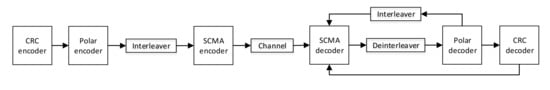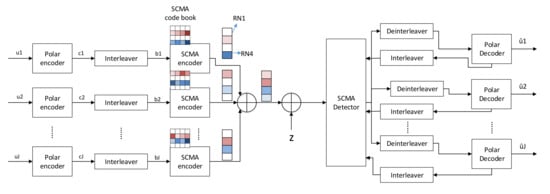 Non-orthogonal multiple access has become the focus of current research, in order to meet the demand of the next generation of mobile communication for large capacity, massive connection, low latency, etc., SCMA is an air interface technology designed in response to the demand of 5G [,,]. SCMA can be jointly designed with channel coding and obtain a joint performance gain. However, the decoding delay and complexity will increase since the joint detection and decoding requires feedback iteration. Therefore, improving the error performance of a joint system while reducing the delay and complexity of decoding has become a key research topic. Most of the current research mainly focuses on the turbo code and LDPC code combined with SCMA [,,,,,,,,,,,,,,].
