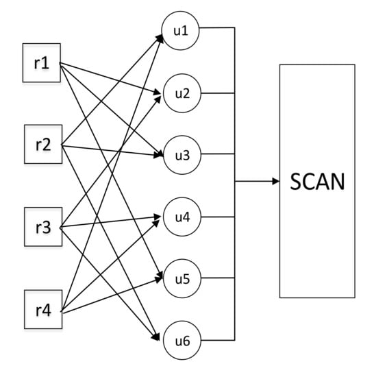 Polar code is a kind of channel coding theory that has been strictly proved to reach the Shannon capacity in the binary-discrete memoryless channel (B-DMC). As a standard control channel coding scheme which supports enhanced mobile broadband, polar code has excellent error correction performance and lower coding and decoding complexity than turbo code and low density parity check (LDPC) code []. Sparse code multiple access (SCMA) merges the high-dimensional modulation and sparse spreading spectrum during the transmission, and directly maps the encoded interleaved bits to a multidimensional codeword in the complex field preset in the codebook, so as to obtain a higher overload [,]. At the receiver, the message passing algorithm (MPA) take the place of the traditional maximum a posterior probability (MAP) detection to obtain the approximate error performance with a lower complexity due to the sparsity of SCMA code [,,]. Decoding methods of the polar code mainly have two categories: the first type is the soft-input hard-output (SIHO) decoding based on the traditional successive cancellation (SC) algorithm [,], such as successive cancellation list (SCL) [], successive cancellation stacking (SCS) [], and successive cancellation hybrid (SCH) [] algorithm. Additionally, the second type is the soft-input soft-output (SISO) decoding, such as belief propagation (BP) [,] and soft cancellation (SCAN) [,] algorithm. In practical applications, SCMA needs to combine with channel coding technology to obtain a better quality of service, which includes turbo code, LDPC code, and polar code. Polar code implementations are less complicated and more versatile than turbo code for channels with relatively low throughput, but polar code lacks market maturity compared with turbo code and LDPC code, and faces greater challenges especially for high-throughput channels. The non-orthogonal resource allocation approach for SCMA scenarios can provide large scale connections and greater throughput. Previous studies have shown that SCMA and polar coding can be designed jointly, which has a significant effect on increasing system capacity and obtaining a certain joint performance gain. Therefore, the study of SCMA combined with polar code detection decoder has profound significance for the overall performance improvement of the communication system. In the existing research, polar code SCMA (PC-SCMA) receiver detection scheme includes separate and joint decoding schemes [,,,]. The SCMA detection and polar decoding are carried out separately for the separate scheme, while the joint scheme iteratively updates the messages between the detector and decoder. At present, the proposed joint scheme mainly includes the joint algorithm which combines MPA and BP, the joint iterative detection and decoding algorithm (JIDD), and the serial joint algorithm S-JIDD.
