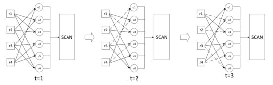 In the traditional S-JIDD algorithm, each RN transmits messages sequentially to all connected UNs during every iterative, as shown in Figure 2. However, in the actual updating process, the convergence rates of different branches in the factor graph are different, in addition, not all messages have the same effect on convergence. Furthermore, the complexity of the MPA algorithm is mainly influenced by the updating of RNs. Therefore, the converged branches are pruned according to the confidence stability of them at the end of each iteration, and the system factor graph is dynamically shrunken to effectively reduce the computational complexity. Secondly, a CRC early stopping criterion is added at the end of each iteration, which significantly avoids the convergence error caused by the decoding deviation.