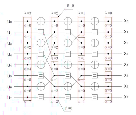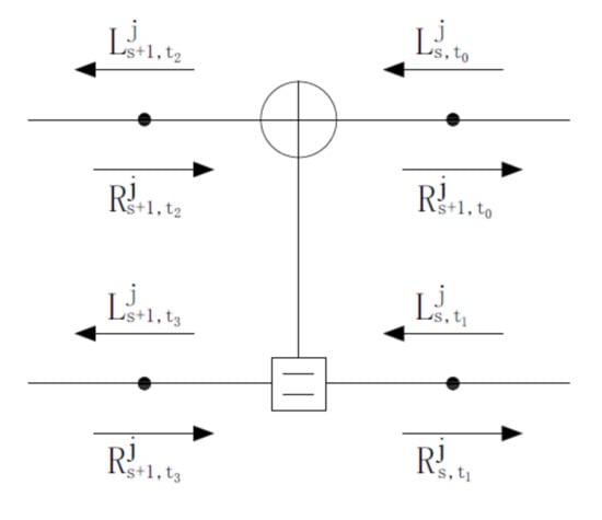 The message passing process of the polar decoder is performed on the factor graph shown in Figure 4. Each node on the factor graph of the SCAN algorithm propagates two types of LLR information and . and represent the LLR message passed to the left and right of the factor graph by node (s, t), respectively, where s = 0,1,…n, n = , denotes the column index and t = 0,1,…N−1, represents the row index, as shown the unit factor graph in Figure 5.