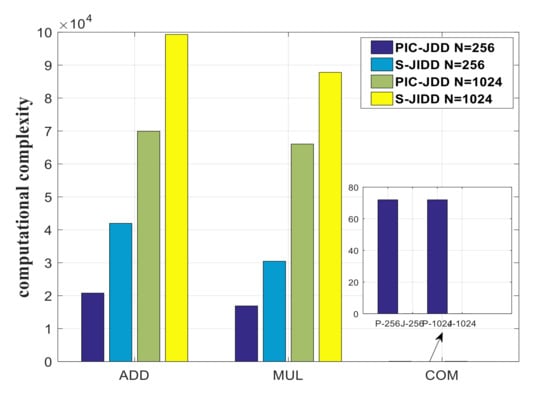 Figure 8 shows the complexity comparison between the PIC-JDD algorithm proposed in this paper and the S-JIDD algorithm when T = 7 and the code length N is 256 and 1024, respectively. It can be seen that the PIC-JDD algorithm has a significant reduction in addition and multiplication computations than S-JIDD. When N = 256, the number of adders in PIC-JDD and S-JIDD are 20,796 and 41,972, and when N = 1024, the number of multipliers are 66,048 and 87,808, respectively. The PIC-JDD saves about 50% adders and 24% multipliers. In addition, compared with the S-JIDD algorithm, a comparison operation is added in the pruning process in PIC-JDD, and the comparison times under both the two code lengths are 72, this is a relatively small computation. The reason why is that during the RN updating, the branch with the largest confidence stability in the previous iterations is pruned from the next iteration to avoid redundant update and which effectively reduces the computational complexity.
