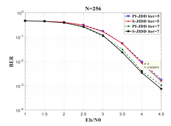 Simulation results of the joint optimization algorithm PIC-JDD which combines PI-JDD with C-JIDD are shown in Figure 13 and Figure 14. BER performance comparison with code length N = 256 under five and seven iterations is shown in Figure 13. It can be seen that the BER performance of proposed PIC-JIDD algorithm is superior to that of the original algorithm under the two iterations. When Eb/N0 = 4.5 and seven iterations, the BER of S-JIDD algorithm is 1.1 × , while that of this paper is 7.74 × , the error performance has a significant improvement. Specifically, when N = 256, the BER performance in five iterations of the PIC-JDD is better than that of the S-JIDD in seven iterations.