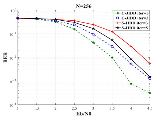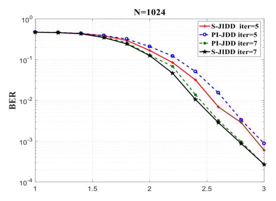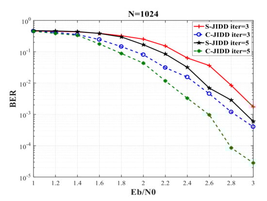 When N = 1024, the BER performance comparison is shown in Figure 12. Similar to the performance comparison above, the BER of the C-JIDD is lower than that of the original S-JIDD algorithm under the same conditions. When Eb/N0 = 3 and three iterations, the BER of the S-JIDD algorithm is 1.74 × , while that of the C-JIDD is 4.01 × . It is also notable that the BER in three iterations of the proposed C-JIDD is lower than the BER of the S-JIDD in five iterations. Similarly, it can be seen from the figure that when BER = 5.98 × and five iterations, this paper has a 0.32 dB gain compared with the traditional S-JIDD.