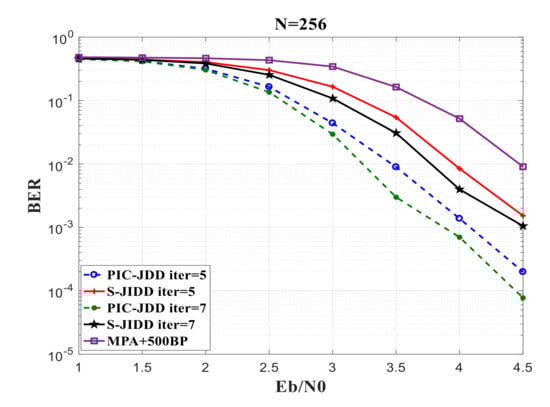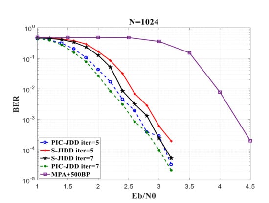 Figure 14 shows the BER performance curves of the several algorithms with N = 1024. It can also be seen that the BER performance of the PIC-JDD proposed in this paper is better than that of the traditional S-JIDD algorithm under the two iteration times. When Eb/N0 = 2.6 and five iterations, the BER of the S-JIDD algorithm is 6.9 × , while that of the PIC-JDD is 1.9 × . It is also worth noting that the BER performance of the five iterations in this paper is better than that of the S-JIDD in seven iterations. Specially, the BER performance of the PIC-JDD in five iterations is much better than that of the joint algorithm combining MPA and the BP with 500 iterations under the two code lengths [].