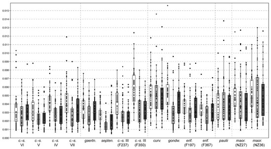 Box plots showing intrastrain variation in absolute asymmetric values. White boxes: cymbelloid shape component, grey: gomphonemoid component, and dark grey: sigmoid component. Vertical lines separate phylogenetic lineages or clades (Figure S2).