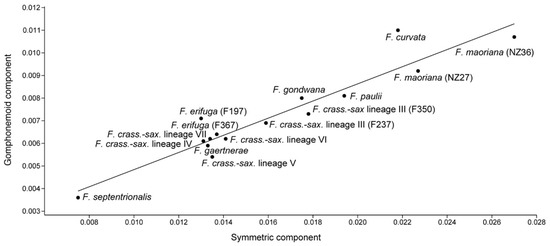 The levels of asymmetry varied among cells (Figure 2), differing significantly between or within a few lineages (Table S3). Nongenetic variation in cell shapes could be affected artificially by imprecision in shape recognition, as valves were not always laying in one plane of focus, and valve outlines were sometimes distorted by girdle bands, or by culture conditions that may affect strain morphology differently (see [54] for references). Unfortunately, our collection of permanent slides did not allow us to purposefully minimize the effect of the abovementioned factors. We reduced the effect of ontogenetic shape changes by selecting strains that were both above their minimum size (fewer cell divisions after sexual reproduction) and exhibiting limited variability in size (Table S1). Insignificant correlations between asymmetric components and size–shape trajectories in several biradially symmetric strains of different genera indicate that at least the asymmetric variation is not profoundly influenced by ontogenetic changes [16,55]. Comparisons of strain pairs from three lineages indicated similar patterns in morphological (a)symmetry within lineages/species (Table 1, Figure 2). F. maoriana Lange-Bertalot & Beier strains shared increased values of all components of (a)symmetry, F. crassinervia-saxonica III shared increased levels of cymbelloid shape, and F. erifuga strains had consistently low levels of (a)symmetry. Furthermore, asymmetric components were not significantly different between strains representing the same lineage, except for the cymbelloid shape component within strain F350 (Table S3). Based on the comparisons of pairs of strains, we do not consider (a)symmetric variation to be strain specific.