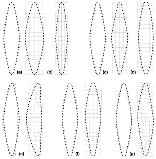 Qualitative shape changes of strain F288 (Frustulia crassinervia-saxonica lineage VI) along the first two relative warp (RW) axes of symmetric components and first axes of asymmetry. (a,b) First of the symmetric axes (the first RW axis: 66.1%); (c,d) Second of the symmetric axes (the fifth RW axis: 4.4%); (e) First of the cymbelloid axes (the second RW axis: 7.5%); (f) First of the gomphonemoid axes (the third RW axis: 5.7%); (g) First of the sigmoid axes (the fourth RW axis: 5.5%).