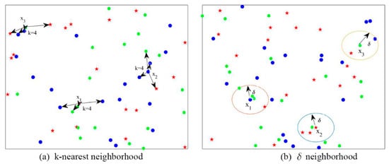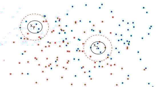 In a real application, specifically in the medical field, the instances are often unevenly distributed in the feature space; that is, the distribution around some example points is sparse, while the distribution around others is tight. Neither the k-nearest neighborhood relation nor the neighborhood relation can portray sample category information well, since the setting of the parameters like r and k can hardly meet both the sparse and tight distributions. For example, the feature space has two classes, as shown in Figure 2—namely, red and green. Red and green represent two different classes respectively, which have different symbols including pentacle and hexagon as well. Around a sample point , the sample distribution is sparse. The three nearest points to all have different class from . If applying the k-nearest neighborhood relation (k = 3), will be misclassified. However, if we employ the δ neighborhood relation method, then the category of is consistent with that of most samples in the neighbors of . On the other hand, the sample distribution around point is tight, and two class samples are included in its neighborhood, and sample will be misclassified when applying the neighborhood relation denoted by the red circle. In fact, if applying the k-nearest neighborhood relation (k = 3), will be classified correctly. Therefore, in Section 3, we proposed a novel neighborhood rough set combining the advantages of the k-nearest neighborhood rough set and the neighborhood rough set.