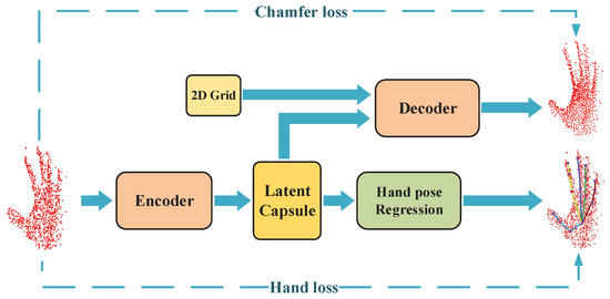 This paper proposes an end-to-end capsule-based network for hand pose estimation from hand point clouds, namely Capsule-HandNet. More importantly, inspired by [15,16], the capsule and the unsupervised dynamic routing mechanism are adopted in Capsule-HandNet, which represents the structural relationships among local parts of hand point clouds explicitly. As shown in Figure 1, Capsule-HandNet, which consists of two main phases: the auto-encoder phase and the hand pose regression phase takes point clouds as input and outputs hand poses. Specifically, the auto-encoder phase is a symmetric evaluation, which is designed to optimize the latent capsule before the hand pose regression. In this phase, the encoder uses dynamic routing to encode the hand point cloud into a latent capsule while the decoder uses the latent capsule to recover the hand point cloud with random 2D grids. Additionally, a symmetric Chamfer distance metric is adopted to optimize the auto-encoder. The smaller the error between the recovered object and the input point cloud is, the better representation ability the latent capsule has. In the hand pose regression phase, a hand pose regression network is attached after the latent capsule to estimate the regression of hand joints. The network is optimized by both Chamfer loss and hand pose loss in the training phase. Finally, the accurate hand pose can be learned from the latent capsule.