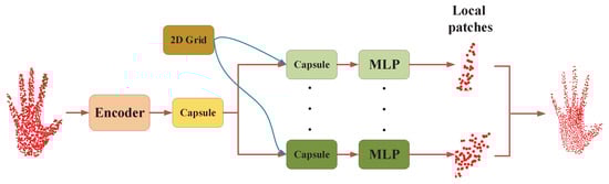 Latent capsule auto-encoder: An auto-encoder procedure is designed in the network to enhance the latent capsule for hand pose regression, as shown in Figure 3. The 1024-dim features are extracted from the input point cloud by PointNet [25]-based layers and are concatenated to generate the PPC. Then, the latent capsule is clustered by dynamic routing. This process can be seen as a encoding process of the hand feature. To improve the performance of the encoder, a decoder is designed symmetrically. As in Figure 3, the decoder takes the latent capsule as an input and employs MLP to reconstruct a patch of points. Different from employing a single MLP to recover points in PointNet, the latent capsule is duplicated m times and is appended with a unique randomly 2D grid [48]. Each grid can be folded to the special 3D object surface of a local area with independent MLPs. Finally, the output patches are glued together to form the whole hand point cloud. Since the size of the recovered object is not required to be the same as the input in Capsule-HandNet, the Chamfer distance [16] and Hausdorff distance [49] are applicable as the metrics for comparing two shapes in this case. Hence, a symmetric Chamfer distance metric is adopted as the loss function for network optimization to minimize the gap between the recovered object and original point cloud, denoted as