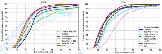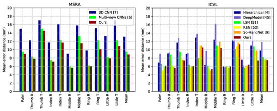 Capsule-HandNet is compared with some of the state-of-the-art methods, including multi-view CNNs [6], LRF [3], the Deep Model [45], DeepPrior [40], DeepPrior++ [12], Crossing Nets [50], HBE [51], 3D CNN [7], V2V PoseNet [10], So-HandNet [9], LSN [52], Hierarchical [4], REN [53]. The fraction of frames and the per-joint mean error distances of different methods in MSRA and ICVL datasets are presented in Figure 4 and Figure 5, respectively. The results of some methods are obtained from trained models available online [3,9,12,40,52,53] and others are cited from corresponding papers [4,6,7,10,45,50,51].