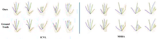 Figure 6 shows the visualization results of Capsule-HandNet on ICVL (left) and MSRA (right) datasets. The 3D hand joint locations estimated by Capsule-HandNet are very close to the ground truth, as shown in the figure, which demonstrates that the network is able to deal with complicated hand structures and obtain accurate hand joints.