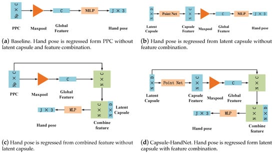 (a) Baseline: A baseline is designed to demonstrate the performance of a network in which both the latent capsule and feature combination are ablated from Capsule-HandNet. As shown in Figure 7a, the global feature is obtained from PPC and is used to regress hand poses directly.