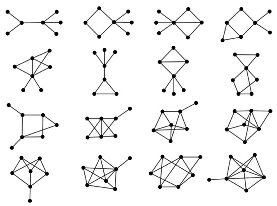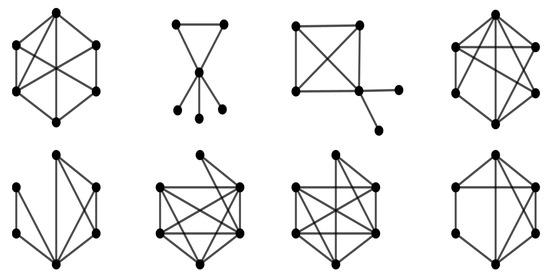 Suppose . Then , and thus . All graphs with this property have at least six and at most 18 vertices. The problem is solved completely for . If , then necessarily and . Hence, . This means that the related graph has two orbits of size 1, an orbit of size 2 and an orbit of size 3. There are 39 graphs of order 7 by this property. Some of them are depicted in Figure 6.