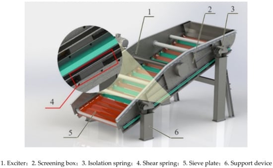 Vibrating screens have been widely applied in materials preparation for activities such as classification and dewatering [1]. The vibrating flip-flow screen (VFFS) is an efficient device for screening moist and fine materials because it has characteristics of high acceleration of screen mesh and no blinding apertures [2,3,4,5,6]. In particular, the application of the VFFS in the coal industry improves screening efficiency, enhances the productivity of the slack coal separation system, and decreases slime content in the lump coal system by 70%, thus increasing the economic benefits [7]. The application of the VFFS in the building of solid waste resources overcomes the problem of damp construction waste blocking, thereby improving the cleanness of soil under the screen.