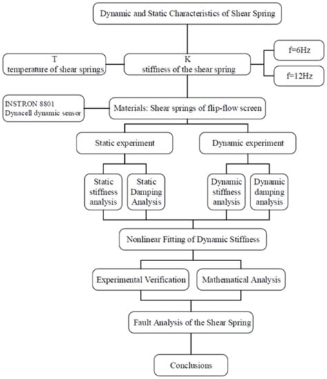 This study was based on the VFFS1848, which are widely used in the classification of moist fine-grained materials in coal, non-metallic mines, construction waste recycling treatment, metal mines and other industries, and which can effectively prevent moist materials from blocking the screen holes and reducing screening efficiency. As shown in Figure 1, shear springs of the VFFS1848 contained a total of 44 pieces, and were symmetrically located between the main screen frame and the floating screen frame. The shear springs were connected to the main screen frame by bolts on one side and the floating screen frame on the other side, and the parameters of the prototype are shown in Table 1; a flowchart for describing the whole of the research work is provided in Figure 2.