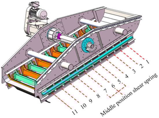 - Eleven sets of shear springs on the left and right sides of the screen body were numbered, respectively, from the feeding direction of the vibrating flip-flow screen;