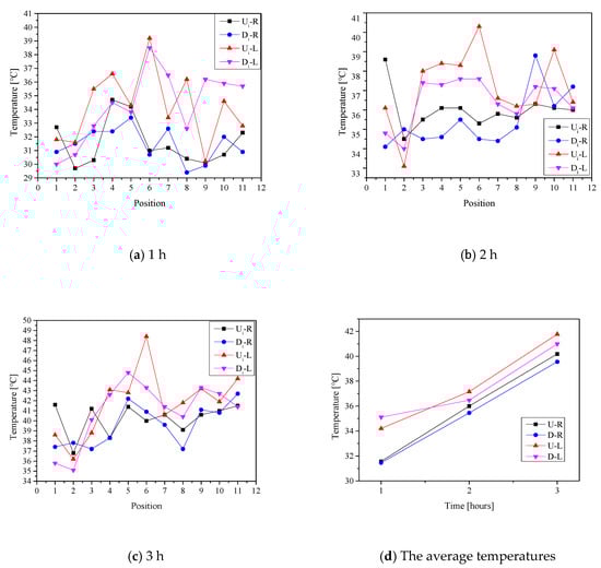 The research object of this experiment was the shear springs of the VFFS1848, which ran without a load for 1, 2, and 3 h. Relevant working condition parameters are shown in Table 3. The temperature of each shear spring under different working conditions was measured and the relationship between temperature and position are shown in Figure 8a–d.