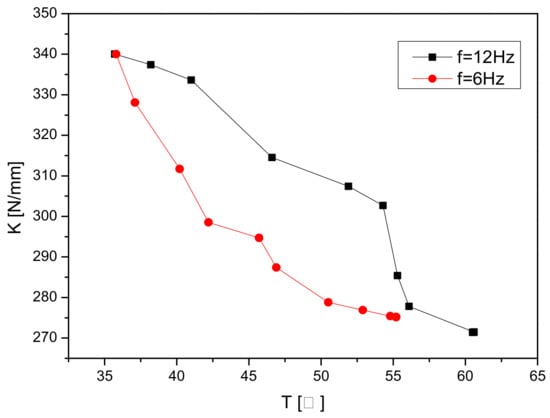 Figure 9 shows that the stiffness of the shear spring decreases with the increase in the working temperature. When the vibration frequency f = 6 Hz, the stiffness K of the shear spring decreased by 13% in the range of 36~45 °C; when the temperature was greater than 45 °C, the stiffness decreased by 5%. When the vibration frequency was f = 12 Hz, the stiffness K of the shear spring decreased by 9% in the range of 54~56 °C, and the decrease was 3% when the temperature was above 56 °C. Thus, at low frequencies, the stiffness change in the low temperature range was obvious, and at high frequencies, the stiffness change in the high temperature range was marked; when the temperature of the shear spring stabilized, the stiffness of the shear spring approached 270 N/mm.