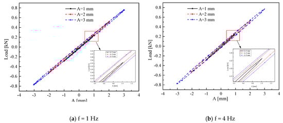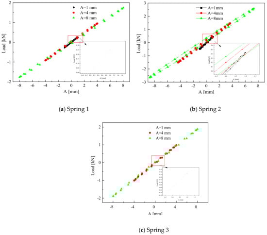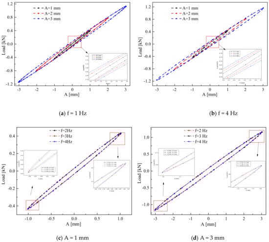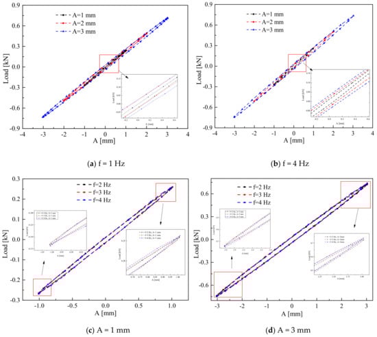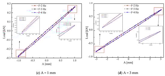 At a static frequency (0.1 Hz), the amplitude load change data of 1, 4 and 8mm were selected for analysis, and the results are shown in Figure 10a–c, respectively.