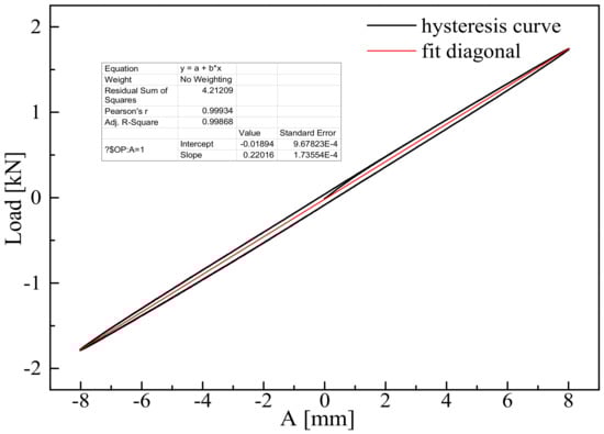 In this study, when only damping was considered, the hysteretic curve was a horizontal ellipse. When damping and stiffness were taken into account simultaneously, the hysteretic curve was an inclined ellipse with a certain inclination. Therefore, based on previous research, it can be approximated that the slope of the hysteresis curve represents the stiffness, as the following formula [31]:
