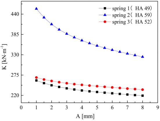 The dynamic stiffness of the shear springs of the vibration flip-flow screen with HA = 50 and shape size of 203 × 70 × 48 (mm × mm × mm) were calculated, and the function was obtained as follows: