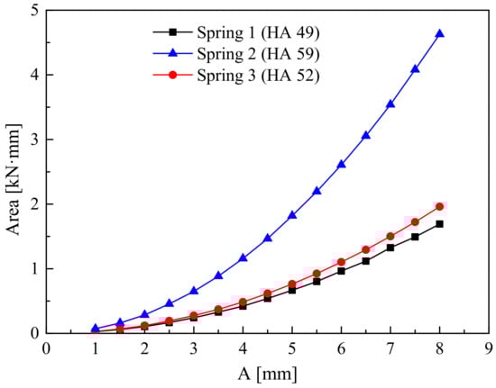 Rubber is a typical viscoelastic material, and the static stiffness of rubber is the ability to resist deformation under static load. Under the action of alternating load, the alternating deformation of the rubber material lags behind the alternating load, which is called the hysteresis effect of the rubber material [29]. The hysteresis curve, also known as the restoring force curve, is the load–deformation curve of the structure under the cyclic action of force, and the slope of the line connecting the maximum amplitude and the minimum amplitude in the hysteresis curve represents stiffness [30]. The stiffness is the value of the external force required to generate a unit deformation of the structure, and static stiffness is the ability to resist deformation under static load. Dynamic stiffness is the ability to resist deformation under dynamic load, and represents each hysteresis loop curve of the shear spring under different conditions.