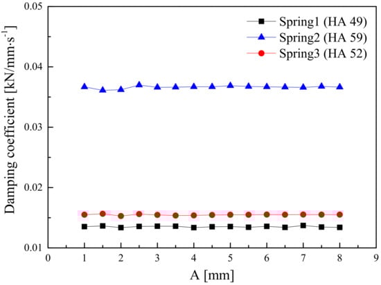 Under the condition of a constant temperature of 19 ± 0.1 °C, frequency of 1~4 Hz, and amplitude of 1~3 mm, the damping coefficients of the three shear springs decreased with the increase in frequency, but did not change with the increase in amplitude. That is, amplitude was not a significant factor affecting the damping coefficients. Shear spring 2 had the largest damping coefficient of the three springs, which indicated that the damping coefficients increased with the increase in hardness. The energy consumption caused by damping was proportional to the square of the amplitude, and changed little with the increase in frequency; thus it can be neglected. The damping coefficients decreased with the increase in frequency and did not change with the change in amplitude.