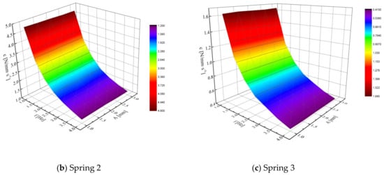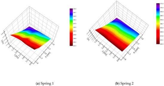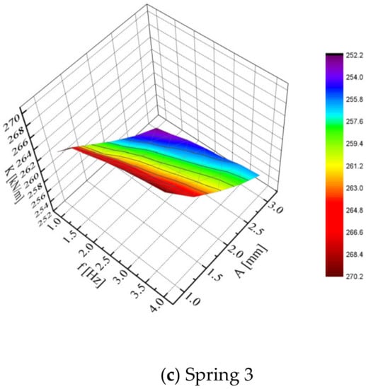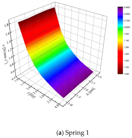 According to the formula of the damping coefficient, the damping coefficients of spring 1, 2, and 3 were calculated, and the three-dimensional curve of the damping coefficients varying with frequency and amplitude were drawn, as shown in Figure 21.