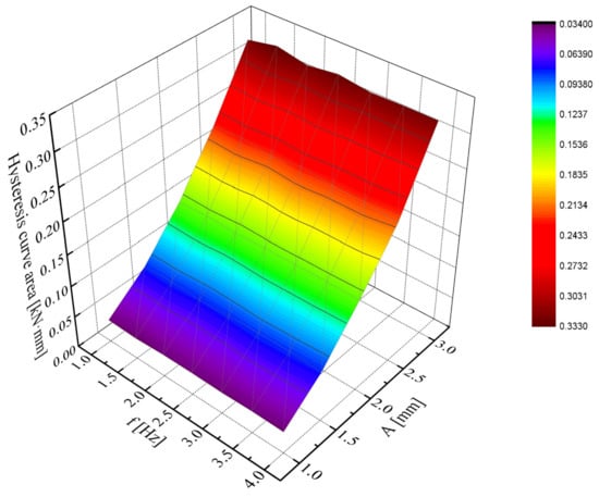 It can be seen from Figure 20 that the area of the hysteretic curve increased with the increase in amplitude. Furthermore, the curve was approximately a power function, but did not change with the increase in frequency.