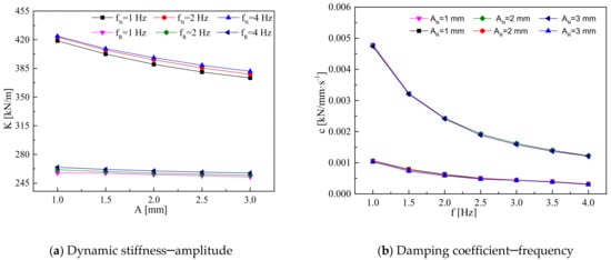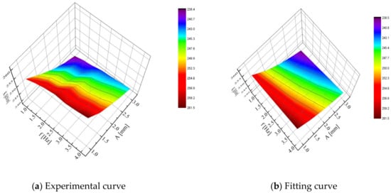 The three-dimensional curves of dynamic stiffness with frequency and amplitude were obtained by fitting, as shown in Figure 22. By comparing the experimental curve with the fitting curve, it can be found that the fitting degree was good.
