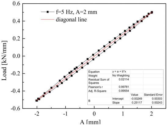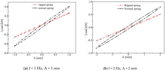 From Figure 23, under the condition of frequency 5 Hz and amplitude 2 mm, it can be seen that the diagonal slope of the hysteretic curve of the spring was 0.25117, which indicated that the stiffness was 251.17 kN/m.