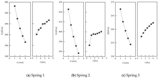- Based on the fitting formula and the experimental results, amplitude and frequency were found to be highly significant factors for the dynamic stiffness of shear springs. Moreover, the amplitude had a greater impact on the dynamic stiffness of shear springs than frequency.