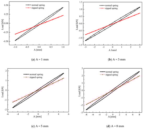To clearly study the change in stiffness and damping of the shear spring before and after being torn in the static test, two groups of shear springs test data were selected for comparative analysis under the same working conditions. Because of the large amount of test data, the hysteresis curves were drawn at the frequency of 0.1 Hz and the amplitude of 1, 3, 5, and 8 mm.