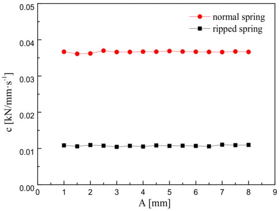 According to Figure 25, the stiffness and damping of shear springs before and after being torn decreased significantly. The stiffness–amplitude and damping coefficient–amplitude curves were plotted as shown in Figure 26 and Figure 27, which compared the ripped and normal shear springs at the frequency of 0.1 Hz. It can be concluded that the static stiffness and damping coefficients of the ripped shear spring decreased sharply under the same working conditions.