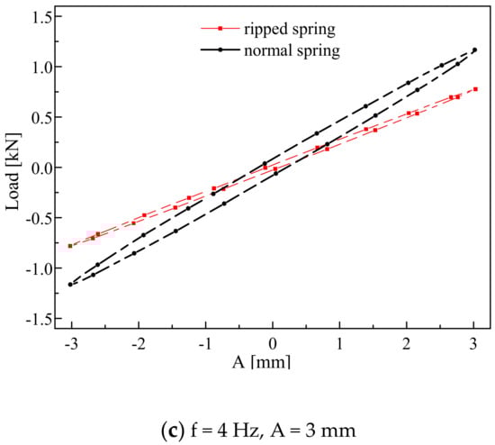 According to Figure 28, the diagonal slope of the hysteresis curve of the ripped shear spring was less than that of the normal spring, and the curvature of the hysteresis curve was greater than that of the normal spring. Thus, the stiffness and damping of the shear springs before and after being torn obviously decreased. To better understand the difference in stiffness and damping before and after being torn, the experimental data of the ripped shear spring was processed and the curves were drawn.