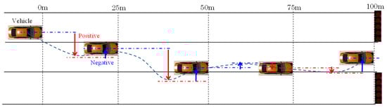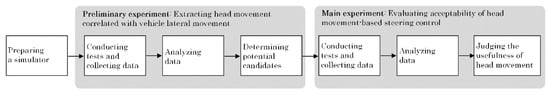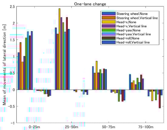 It is known that drivers tilt their head toward the center of a curve [23,24]. This reaction helps reduce motion sickness. However, we wondered whether head movement in other directions is correlated with the vehicle’s lateral movement when changing lanes. In addition, it is worth investigating whether head movement can improve steering control. Our hypotheses associated with these questions were: