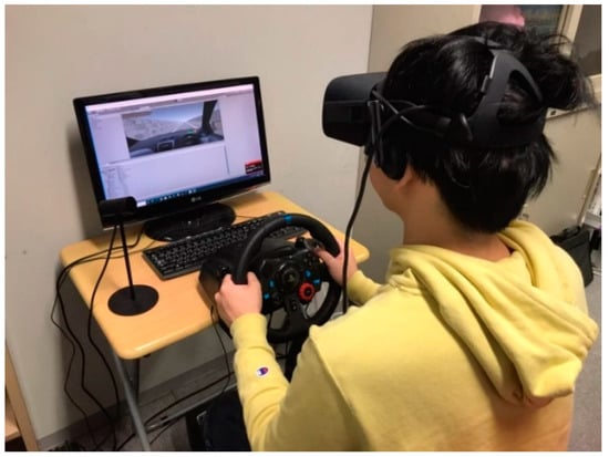 The CPU of the computer used in this experiment was the Core i7-7700 (3.60 GHz), and the computer had 16 GB memory. We used Oculus Rift (CV 1) for the visual and auditory presentation of the VR space. The field of view (FOV) of the head-mounted display (HMD) was 110 degrees, the refresh rate was 90 Hz, and the weight was 440 g. The media content for the driving simulation was created using Unity 2017.2.1.f1 (64-bit). Scene frames were updated at a rate of 50 Hz. The Logicool LPRC-15000 was used for steering a vehicle, as shown in Figure 2. Participants did not need to operate the accelerator pedal or the brake pedal as the vehicle speed was controlled by the system. Additionally, for this experiment, we used a chair without a headrest to ensure the participants had unobstructed head movement.