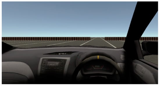 We developed a driving simulator in which the participants drove in a virtual space while avoiding obstacles. The vehicle speed was set at 80 km/h. The vehicle length and height were 4.5 m and 1.4 m, respectively. The width was either 1.6 m (standard type) or 1.2 times wider, i.e., 1.92 m (wide type). The basis of these options was that the width of the category of small vehicles in Japan is 1.7 m or less. Vehicles beyond this size are classified as standard size vehicles. The location of the steering wheel was set for either left-hand drive vehicles or right-hand drive vehicles (Japanese standards). The viewing position of a participant was set at 0.35 m from the center of the vehicle to the left (left-hand drive) or right (right-hand drive) in the lateral direction, 1.05 m above the ground, and 2.21 m from the front of the vehicle. A sample image presented on the HMD is shown in Figure 3. The three-dimensional and stereoscopic views of the scene changed depending on the participant’s head movement. The local coordinate system of the head was independent of the global coordinate system. The local coordinate system was reset and the head position was set to zero when the participant sat on a chair and started the experiment.