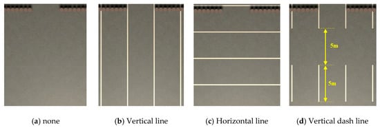 The road prepared for experiments had countless lanes and no side walls. All lanes except one were blocked by obstacles (drums). Participants were asked to drive the vehicles so as to navigate through the obstacles. Each lane was 3.5 m wide. Here, we prepared four kinds of lane separation patterns as shown in Figure 4, considering the possibility of applying the proposed head motion-based interaction technique to situations where people drive vehicles in different locations. Vertical and vertical dash lines were most common, but horizontal lines and no-line patterns may have appeared under the wilderness or fanciful VR scenes. Examination of the influence of the variety of line patterns requires not missing any serious variables. In the same manner, we decided to apply the variable of lane change pattern, which has two options: one-lane change and two-lane change, assuming the difference in avoidance levels affects the head movement.