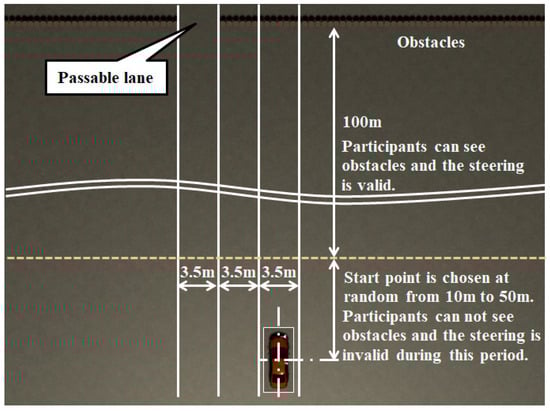 In each trial, the starting position of the vehicle was randomly assigned from 110 to 150 m ahead of the obstacles’ position. The appearance of the obstacles was controlled so that no obstacles were visible to the participants until they were 100 m ahead of them. In addition, the steering control remained invalid until the vehicle reached that point. This was done to eliminate the influence of unwanted steering operations and to encourage not starting the steering operation until the obstacles were visually confirmed. Figure 5 shows an experiment setting in which the participant is expected to move two lanes to the left.