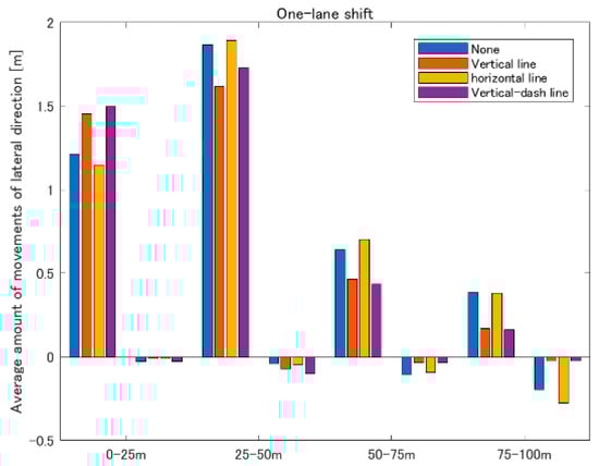 From the results in the previous section, it was found that the head motion in x, yaw, and roll was associated with lane change control. We chose those three as the potential candidates for the interaction technique of steering the vehicle. Additionally, in the main experiment, the steering wheel location was in the right-hand position to eliminate the influence of the seating position. As for the width, there was no significant difference between x, yaw, and roll. Therefore, we decided to adopt the standard width. Although there was no significant difference in the head movement between different lane lines, the timing of steering actions was different depending on the zone as well as the lane line. Figure 8 shows how much the vehicle had shifted to the running direction (positive)—the direction toward a passable lane—and how much it had turned back (negative) at each zone (see Figure 9). The sum of the values in all of the four zones was ideally equal to 3.5 m, which corresponds to the width of (one) lane shift. This gave us the lane line for the main experiment. Here, the lateral movement regarding the lane line is classified into two groups; one includes no line and a horizontal line, and the other includes a vertical line and a vertical dash line. We chose the no line and the vertical line for the main experiment as representatives for the groups.