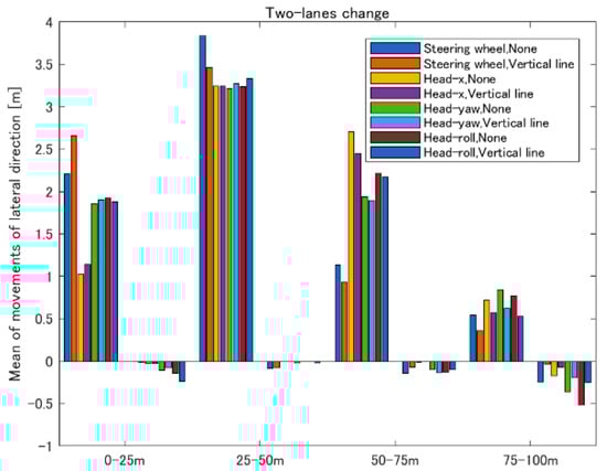 By comparing the behavior in the two-lane change to that in the one-lane change, it would be reasonable to imagine that the lateral movement doubles. Lateral movement in the first 25 m zone in the case of head movement interfaces was similar in both the one-lane change and the two-lane change. However, the difference in the 50–75 m zone was much greater in ratio than expected (twice). In other words, the head movement interfaces resulted in postponing the lane changing movement compared to the steering wheel interface. This may not be a favorable situation because of the increase in risk. There is an opportunity to cope with this by building a model of the human behavior, and then adding a proper compensation mechanism based on the model. Meanwhile, Head-yaw and Head-roll generated larger negative movements than Head-x. This coincides with the questionnaire results in that their usability and realistic motion were lower.