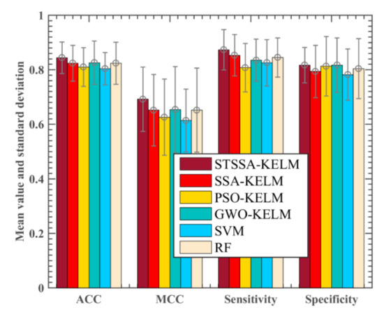 To validate the usability of this approach, we present a comparative study with five other effectiveness machine learning models, including SSA-KELM, PSO-KELM, GWO-KELM, SVM, and RF. The comparison results of the six methods are shown in Figure 2. The results show that the STSSA-KELM model is superior to the other five models in four evaluation indexes. This signifies that the STSSA-KELM model obtains better performance and stability by adding a spatial conversion mechanism. In the ACC evaluation index, the STSSA-KELM model has the best evaluation effect, which is 1.80 percentage points higher than GWO-KELM. SSA-KELM, RF, and PSO-KELM are in the second place, SSA-KELM is 2.00 percentage points lower than STSSA-KELM, the effect of SVM is the worst, GWO-KELM variance is the largest, 0.079. In the MCC evaluation index, the STSSA-KELM model still acquired the best results, followed by GWO-KELM. GWO-KELM was 3.80% lower than STSSA-KELM, SSA-KELM, RF, and PSO-KELM were behind, SSA-KELM was 4.00% lower than STSSA-KELM, SVM effect was the worst; GWO-KELM variance was the largest, 0.158. From the perspective of sensitivity evaluation indexes, the STSSA-KELM model gets the best evaluation effect, followed by the SSA-KELM model, with a difference of only 2.00 percentage points, followed by RF, GWO-KELM, and SVM. PSO-KELM model has the worst effect and the largest variance, reaching 0.089. The results of STSSA-KELM and GWO-KELM were the best. PSO-KELM, RF, and SSA-KELM are the second, in which the difference between SSA-KELM and STSSA-KELM is only 2.30 percentage points; the worst is SVM, and the variance of PSO-KELM is the largest, reaching 0.109.