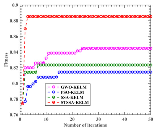 To characterize the convergence of the proposed STSSA-KELM model, we also record the tendency that the accuracy of three kinds of KELM models, which are based on swarm intelligence algorithm, changes with population iteration. It is revealed in Figure 3 that after many iterations, the STSSA-KELM model can quickly and continuously jump out of the local optimum to reach the optimal accuracy, indicating that the STSSA-KELM method has strong local search ability and global search ability. The main reason is that the spatial transformation mechanism enhances the local search ability and global search ability of the SSA, and makes the hybrid algorithm better balanced between the exploration and the exploration. By observing the curve in Figure 3, it is found that the SSA-KELM model needs more iterations to converge, and the accuracy is not as high as STSSA-KELM. GWO-KELM has the second-highest accuracy, which can continuously jump out of the local optimum, and the improvement with iteration accuracy is not apparent. PSO-KELM has the lowest accuracy among all algorithms, far less than the STSSA-KELM model, and the improvement with iteration accuracy is not apparent, so it is easy to sink into the local optimum.