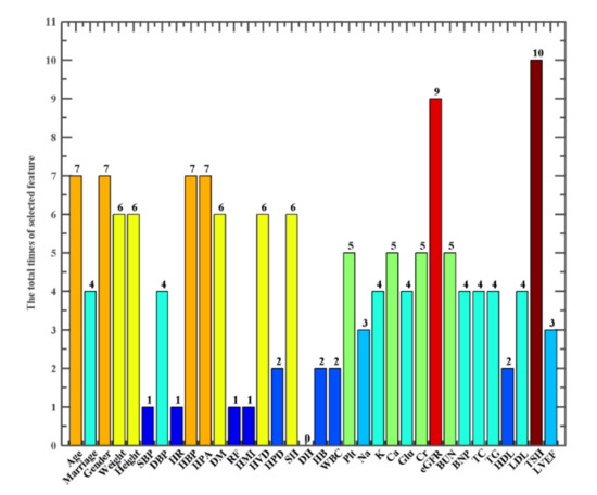 Frequency of the features selected by STSSA-KELM via the 10-fold CV scheme.