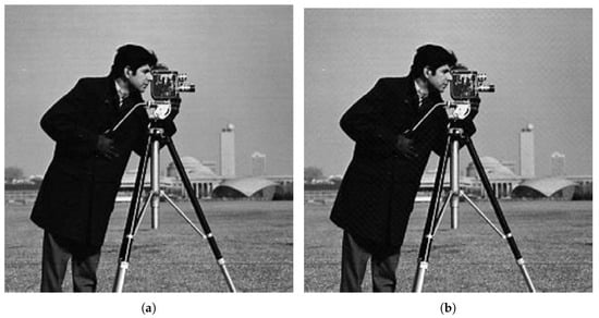 Results obtained for Cameraman with . The proposed technique with key size 7 used to hide information in the Cameraman image (a) and the stego image (b).