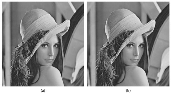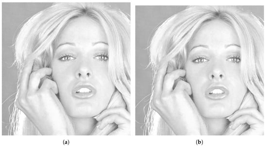 Results obtained for Tiffany with . The proposed technique with key size 7 used to hide information in the Tiffany image (a) and the stego image (b).