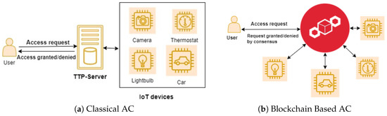 Furthermore, to overcome these challenges, researchers have begun to work with decentralized environments over IoT access management. A decentralized technology ensures reliability, privacy, and scalability, which are more suitable for fast-growing IoT environments. Recently, blockchain technology is the concept of decentralized architecture that is more suitable for the ecosystem for IoT [9], due to immutability, distributed ledgers, and sharing information, so it can handle and manage transactions without relying on third parties. A classical and blockchain-based access control is presented in Figure 1.